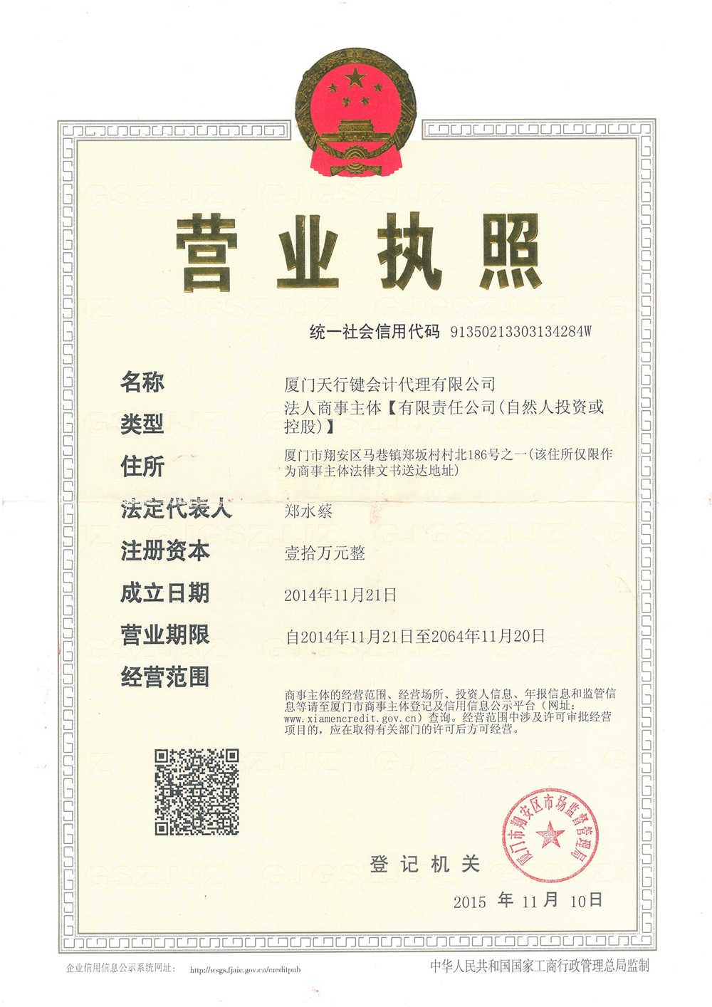 厦门天行键会计代理有限公司位于厦门市翔安区马巷镇郑坂村村北186号之一交通便利。厦门天行键会计代理有限公司本着“客户第一,诚信至上”的原则,欢迎国内外企业/公司/机构与本单位建立长期的合作关系。热诚欢迎各界朋友前来参观、考察、洽谈业务。郑素萍代表厦门天行键会计代理有限公司欢迎新老客户来电咨询。