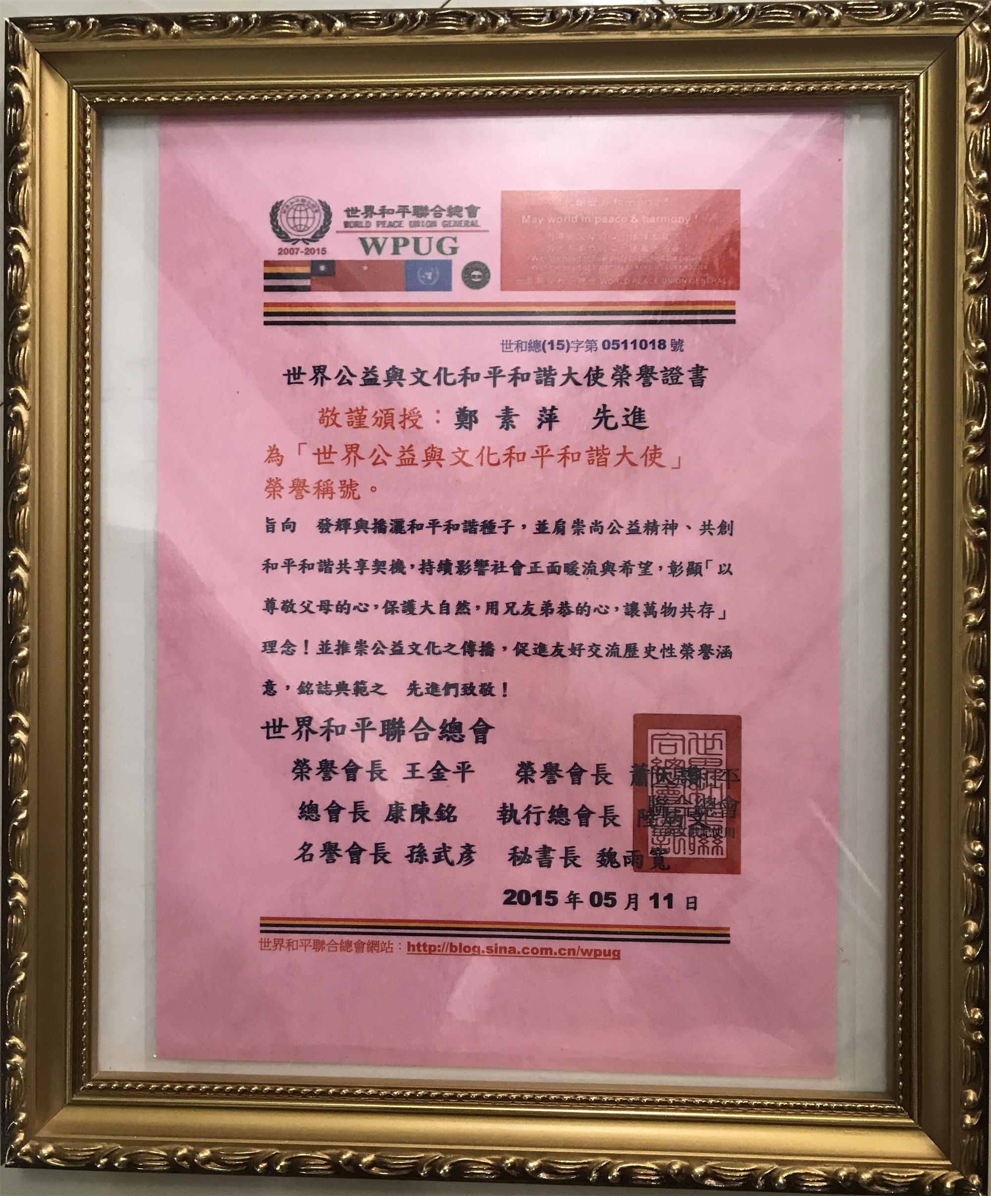 郑素萍先进获世界公益与文化和平和谐大使荣誉证书